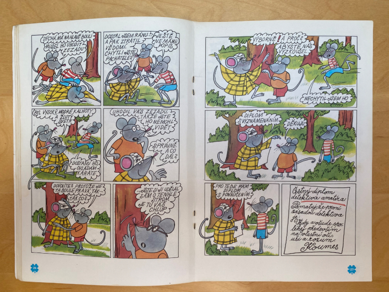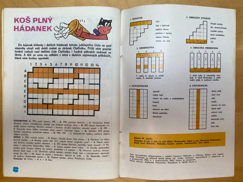 Obtížně sehnatelné číslo. Obálka čistá, pevná, jen v horní části u hřbetu malý zásek (necelý 1 cm) a drobné zašpinění. Hřbet pevně drží, jen u sponek na zadní stránce dvě "fuky". Sponky téměř bez koroze. Velká křížovka neluštěna, v malých vepsány jen tajenky tužkou.