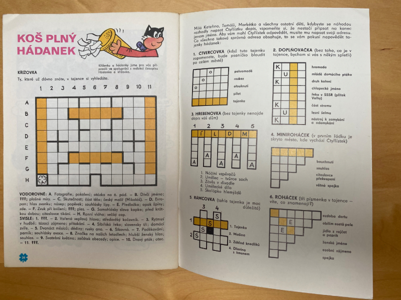 Krásný stav, obálka čistá, bez natržení, hřbet pevnuý. Horní rohy mají náznak přehybu. Křížovky neluštěny!
