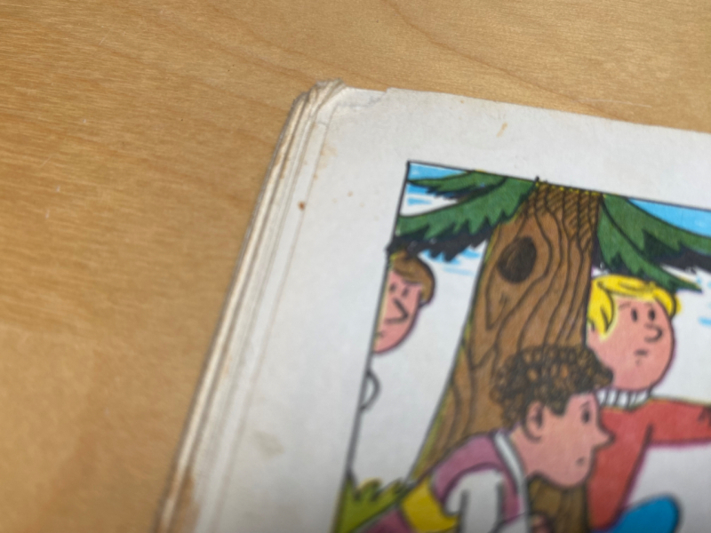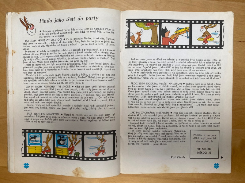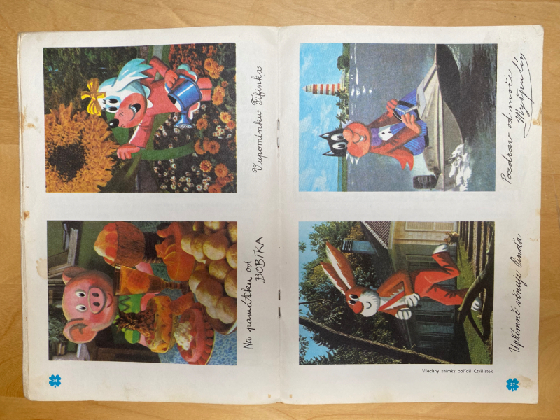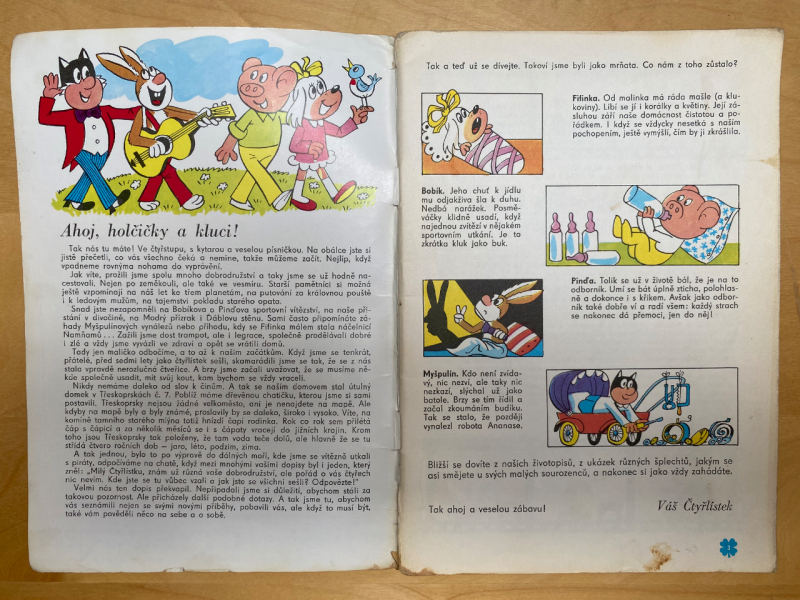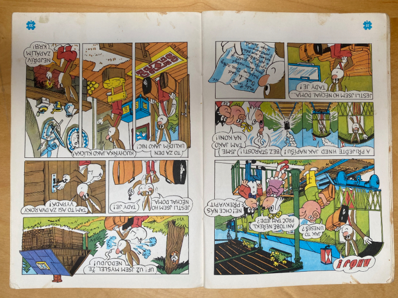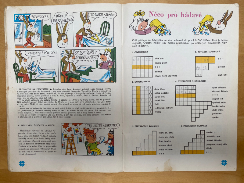 Pěkný stav, jen na zadní stránce "odkousnutý" kousek horního růžku a části u horní sponky. Uvnitř na několika stránkách hnědá skvrna, ta nejvýraznější nafocena. Křížovky luštěny tužkou. Uprostřed nechybí dvojstránka s "fotkami" postaviček.