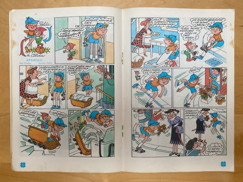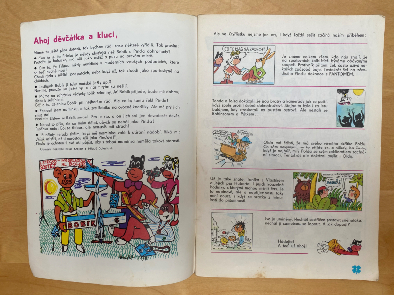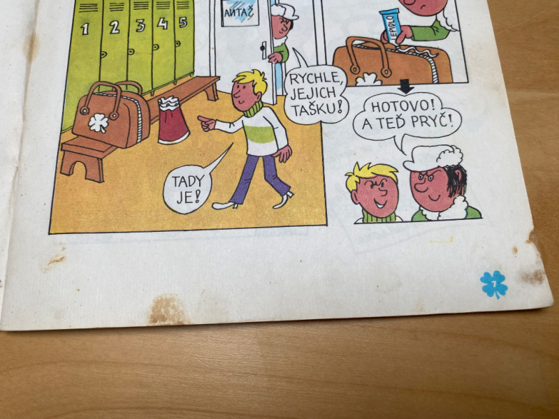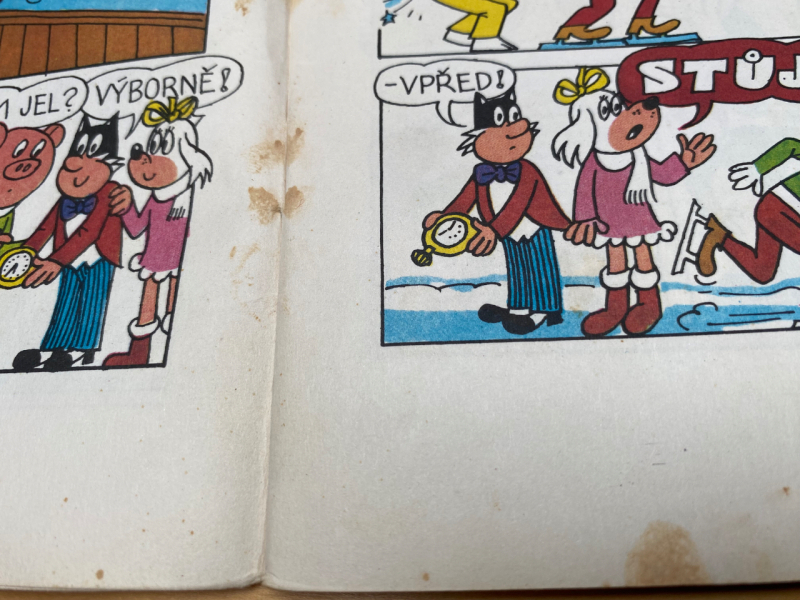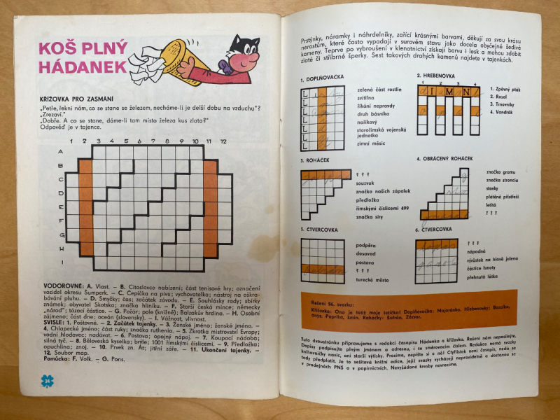 Celkově pěkný stav, ale uvnitř na hodně stránkách zašpiněno, větší fleky. Obálka je ale pevná, hřbet bez natržení, na titulce jen drobné znečištění v oblasti ducha. Velká křížovka neluštěna, v malých vepsáno jen několik slov tužkou.