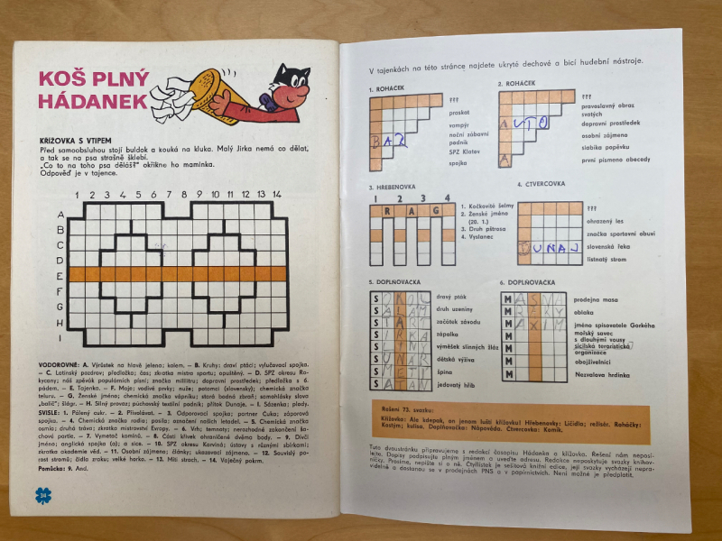 Krásný stav, obálka pevná, vše čisté, časopis je bez poškození. Hřbet drží po celé své délce. Pod sponkami nepatrné známky koroze. Velká křížovka neluštěna, v malých vepsáno pár slov mikrofixem, zbytek tužkou.