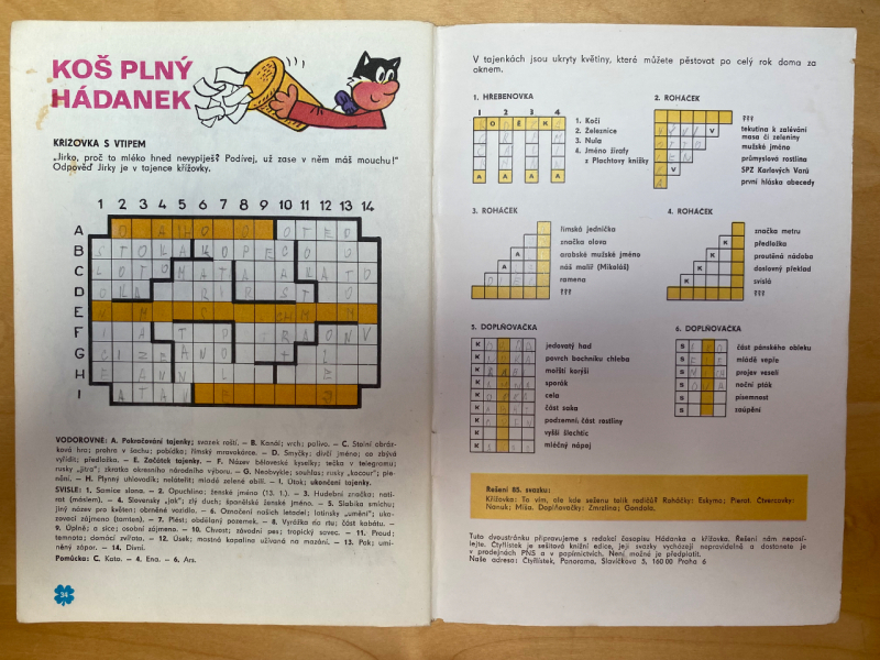 Velice pěkný stav, čistý, uvnitř flíček na stránce s velkou křížovkou. Hřbet dole nepatrně rozklížený (as 1-2 mm), na zadní stránce u ořezu 2 drobné záseky. Křížovky luštěny jen částečně, tužkou.