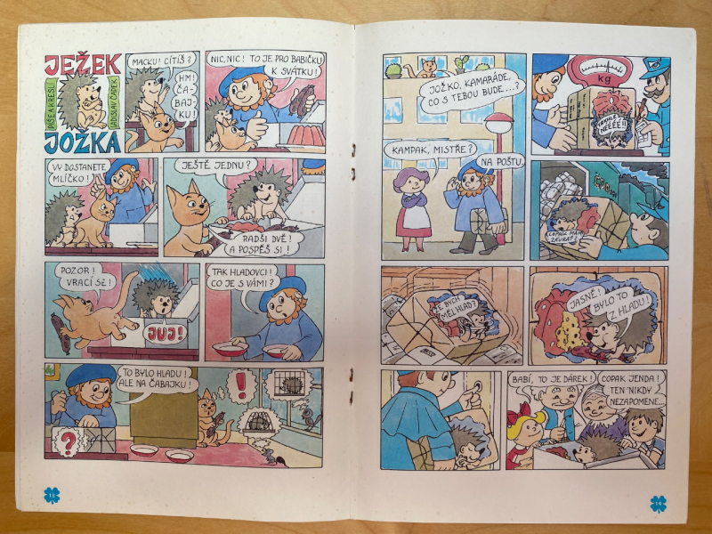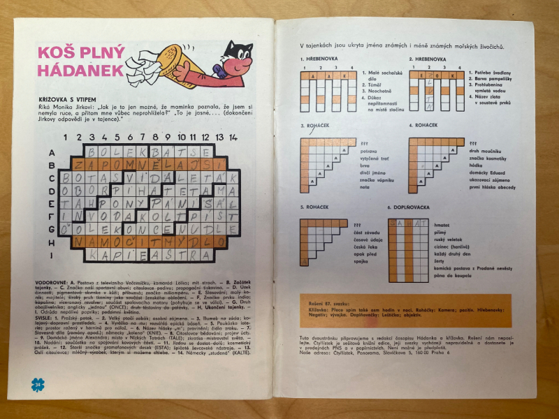 Velmi pěkný stav, obálka pevná, bez natržení, vnitřek čistý. Hřbet nahoře asi 2 mm rozklížený, u hřbetu drobné náznaky vrásek. Pod sponkami uvnitř mírně zarezlé. Na zadní stránce (vedle stromu) drobný flíček. Velká křížovka luštěna tužkou, v malých vepsána jen dvě slova.
